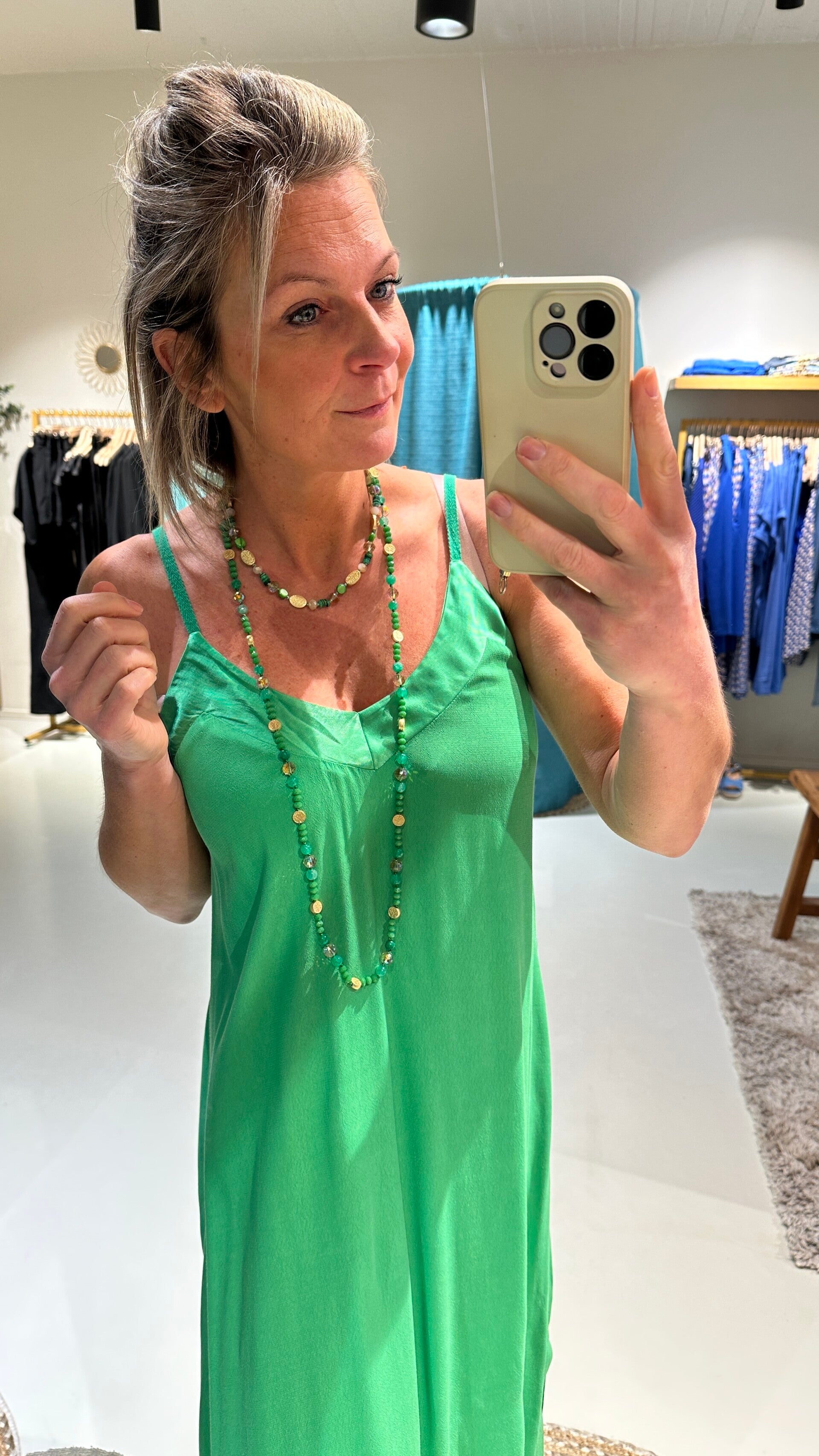 Soepelvallende jurk welke bovenaan afgewerkt is met een glanzende boord.  Je draagt deze los of kan tailleren met een fijn riempje.